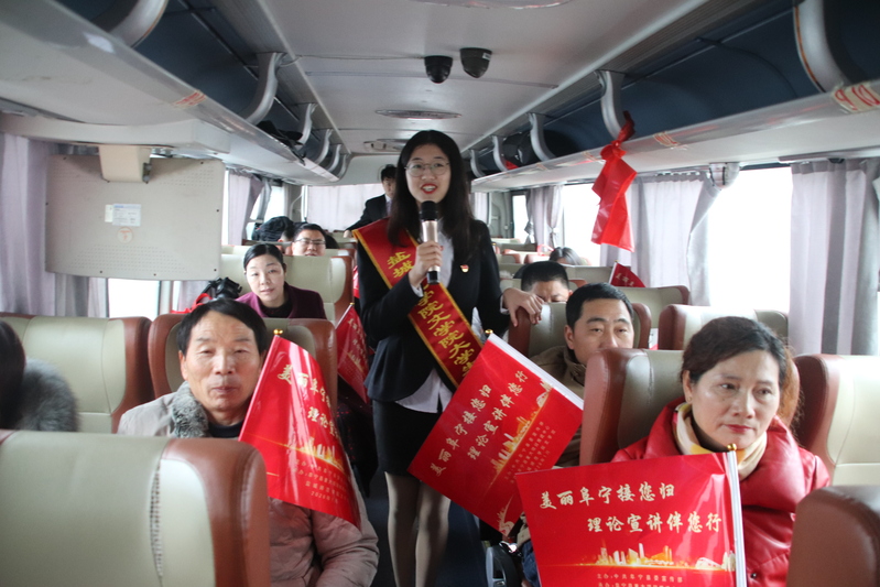 “各位父老乡亲,欢迎大家乘坐幸福快车,今天我们一起回家。”随着大学生志愿者的热情指引,34名阜宁籍在沪务工群众代表带着行李,登上返乡“美丽阜宁接您归”专用车。在回阜宁的汽车上,文学院大学生志愿者用理论宣讲《法治的温度》《守初心是一辈子的事》、诗朗诵《盐城,一个让人打开心扉的地方》、歌曲《强军战歌》等多种形式的宣讲与阜宁老乡一路相伴,传递正能量,讴歌新时代,赞美新生活。汽车过道就如同一方舞台,文学院大学生志愿者在这里开展理论惠民宣讲活动,为大家宣传党的创新理论,宣讲家乡的变化,解读回乡创业就业的优惠政策,让大家一路受益、一路欢乐。