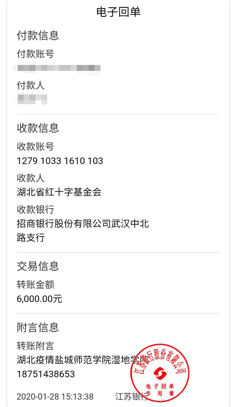 倡议书一经发出,湿地学院全体教职员工立即响应,纷纷奉献爱心。截至目前,共收到善款6000元,已于第一时间汇入武汉新型冠状病毒肺炎防控指挥部指定账户。湿地学院院长唐伯平教授表示“湿地学院以爱的名义开展新年第一次行动。我们不仅仅是在为驰援武汉和抗击冠毒肺炎尽绵薄之力,更重要的是宣传、倡导和践行尊重自然、热爱自然的理念。这是湿地学院应有的担当。让我们一起为武汉加油,共同打赢这场疫情防控战!”