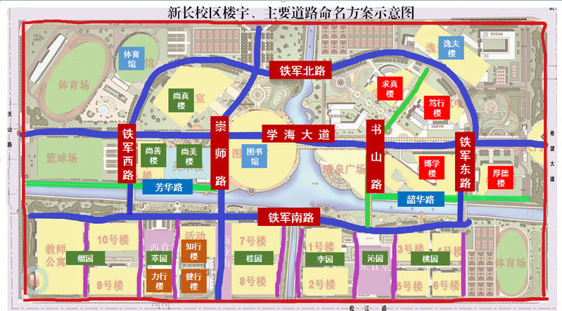 为体现学校办学理念和办学特色,丰富校园文化内涵和育人功能,提升校园文化建设品位,学校组织开展了新长校区楼宇、主要道路命名工作。经过多方听取意见、专家座谈研讨、教代会执委会讨论、校长办公会研究等环节,形成下述命名方案(示意图见附件)。现面向全校师生公示。