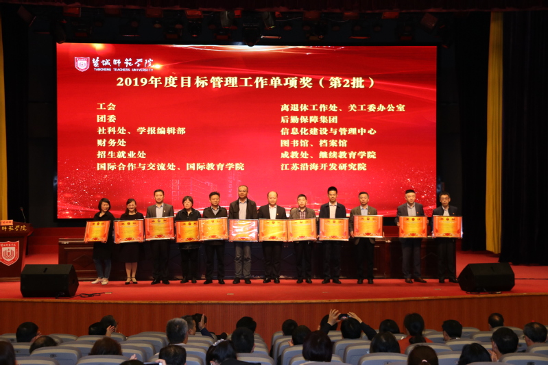 党委副书记、副校长黄志纯宣读了2019年度目标管理工作先进单位的表彰决定。校领导为获得目标管理工作先进单位和单项奖的单位代表颁奖。