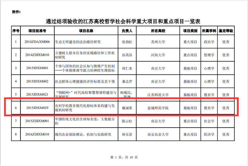 与此同时,中心参加结项的3项江苏高校哲学社会科学研究重大项目和1项重点项目均顺利通过结项验收,其中戴斌荣教授主持的基地重大项目《农村学校教育现代化指标体系构建与发展机制研究》鉴定等级为“优秀”。