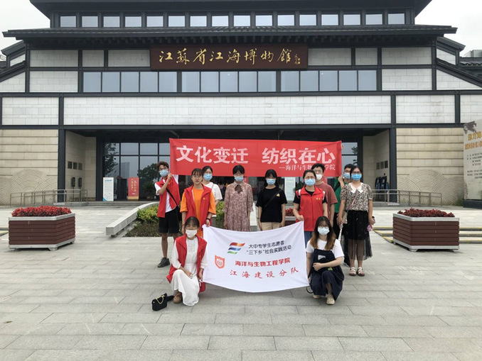 7月21日,海洋与生物工程学院 “文化变迁,纺织在心”实践团成员前往江苏省海门地区。志愿者们在参观江苏省江海博物馆过程中,家乡的文化认同感与荣誉感得到了提升。此外队员们还前往南通市海门区中国叠石桥国际家纺城,调查了海门区纺织业微小企业在疫情期间的恢复情况。志愿者们在走访实践过程中深入了解了海门纺织企业经济的发展过程,通过系列实践活动加强了队员们为家乡建设做出奉献的决心。