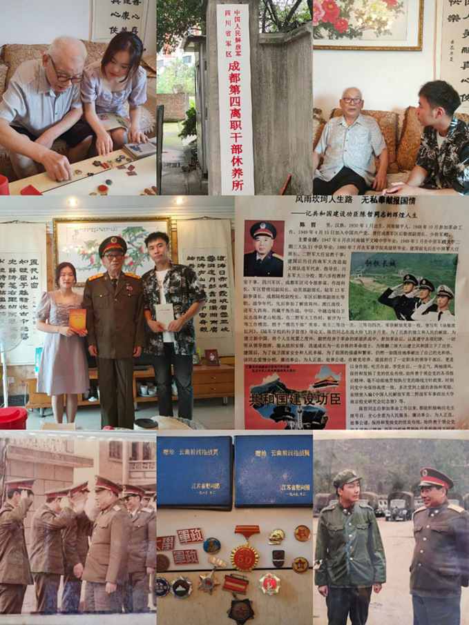 7月31日下午,商学院“走访革命老兵,传承红色基因”暑期社会实践团成员来到中国人民解放军成都第四干部修养所,走访慰问了曾参加过解放郑州、渡江战役、中越边境自卫反击战等著名战役的解放军少将、原陆军学校副校长陈哲。陈哲将军耐心回答同学们提出的问题,还拿出了许多老照片、军功奖章和参战资料,并简述他们的由来。(范华莉)