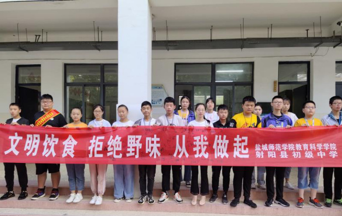 7月13日以来,教育科学学院“科学战‘疫’,守护身心健康”博爱青春团队一行分别到射阳县春晖幼儿园、阜宁县实验小学、射阳县实验初级中学等学校,面向中小学生开展科学防控知识宣传活动。志愿者通过宣讲、知识问答、观看视频、演示等多种方式向同学们详解介绍了科学防控知识。同学们认真倾听并和志愿者一起在“文明饮食 拒绝野味 从我做起”的横幅上郑重签字。