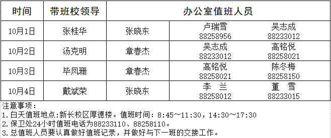 KY开元集团官网入口国庆节、中秋节总值班安排表