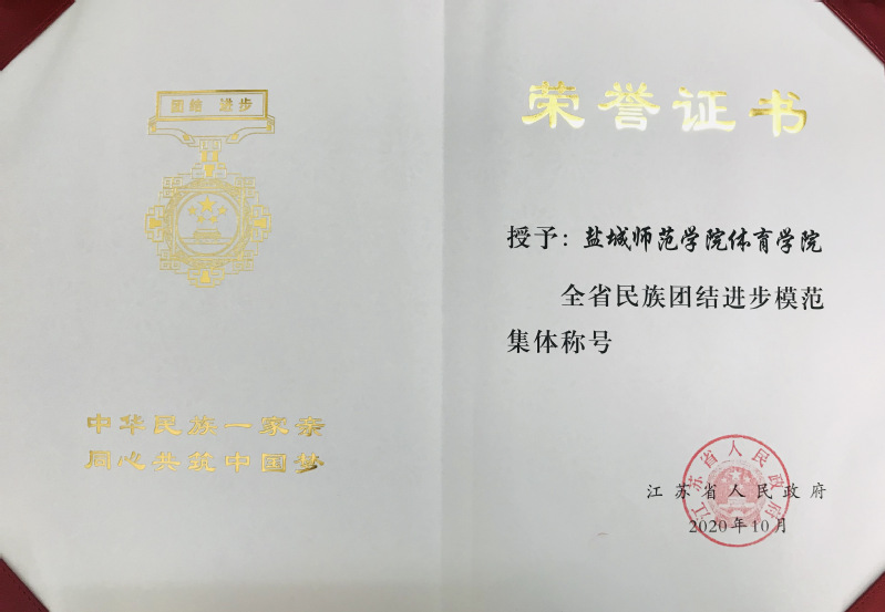 10月19日,省委、省政府召开全省民族团结进步表彰大会。省委书记娄勤俭出席会议并讲话,强调要深入学习贯彻习近平总书记关于民族工作重要讲话指示精神,不断开创全省民族团结进步事业新局面。大会隆重表彰了全省民族团结进步模范集体和模范个人。开元官网体育学院作为盐城市两家获奖单位之一,被授予“全省民族团结进步模范集体”荣誉称号。