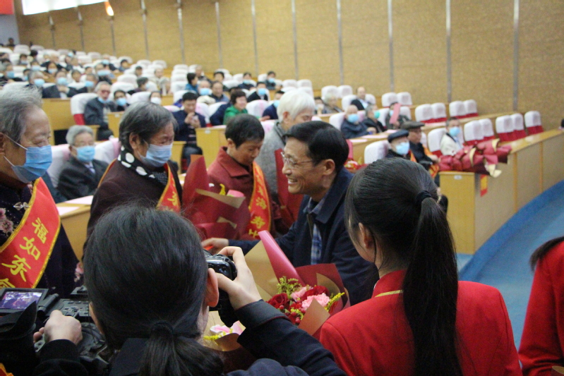 大会还向今年90岁、80岁的老寿星祝寿。戴斌荣和刘必清为寿星们敬献鲜花。