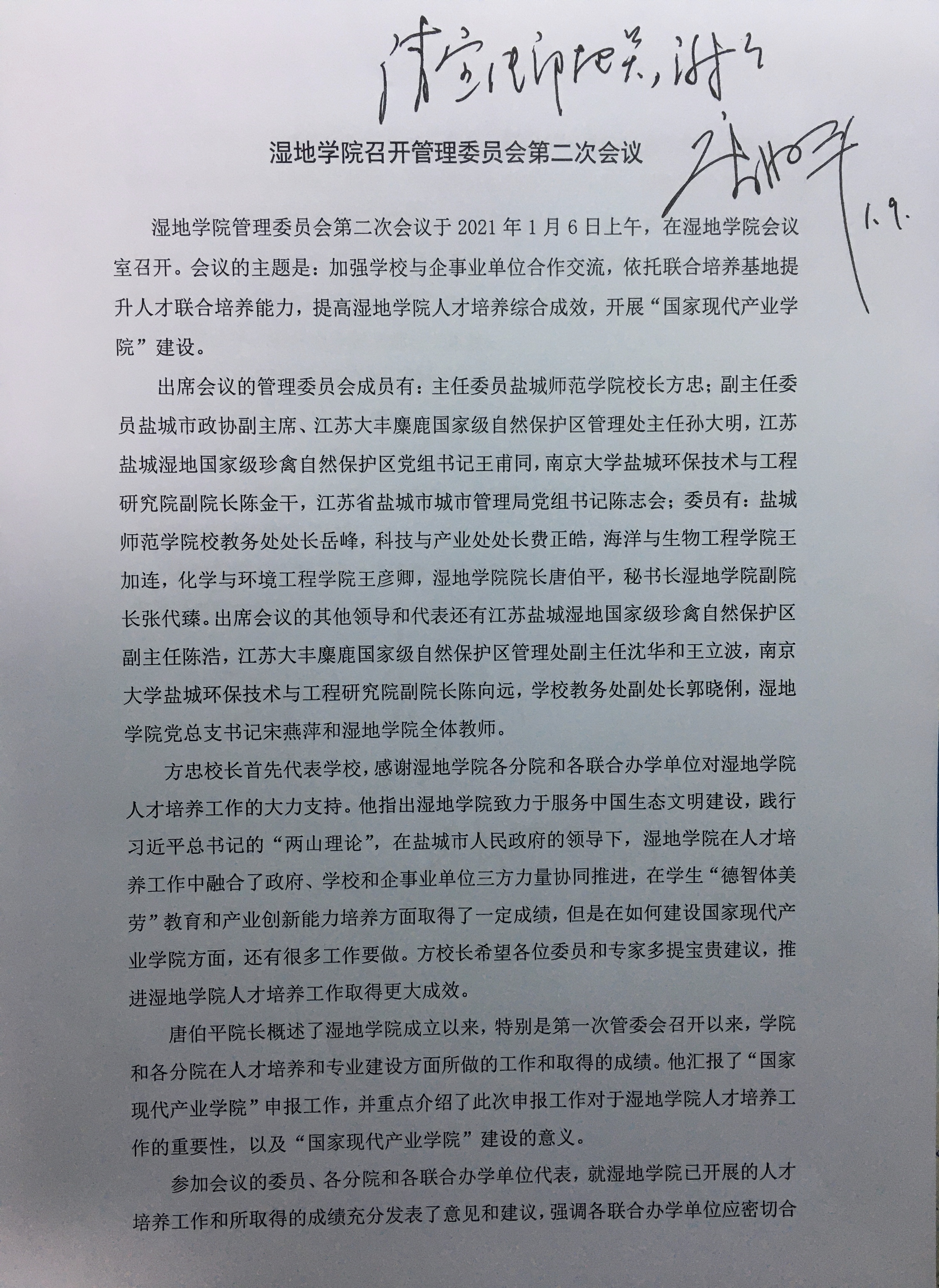 出席会议的管理委员会成员有:主任委员KY开元集团官网入口校长方忠;副主任委员盐城市政协副主席、江苏大丰麋鹿国家级自然保护区管理处主任孙大明,江苏盐城湿地国家级珍禽自然保护区党组书记王甫同,南京大学盐城环保技术与工程研究院副院长陈金干,江苏省盐城市城市管理局党组书记陈志会;委员有:KY开元集团官网入口校教务处处长岳峰,科技与产业处处长费正皓,海洋与生物工程学院院长王加连,化学与环境工程学院院长王彦卿,湿地学院院长唐伯平,秘书长:湿地学院副院长张代臻。出席会议的其他领导和代表还有江苏盐城湿地国家级珍禽自然保护区副主任陈浩,江苏大丰麋鹿国家级自然保护区管理处副主任沈华、王立波,南京大学盐城环保技术与工程研究院副院长陈向远,学校教务处副处长郭晓俐,湿地学院党总支书记宋燕萍和湿地学院全体教师。