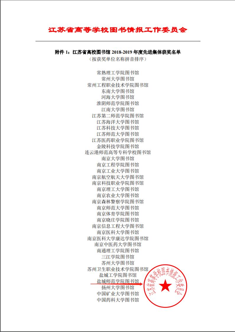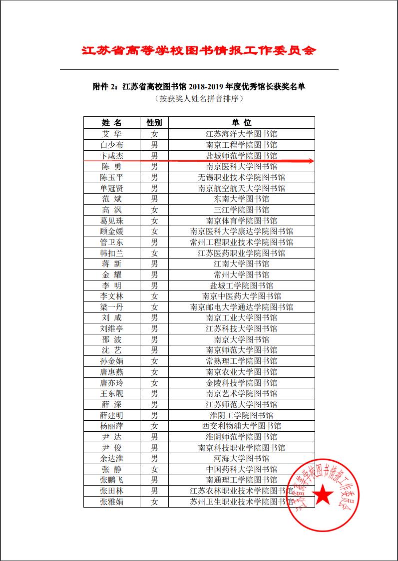 坐标网讯 近日,江苏省高校图书馆2018-2019年度先进集体和优秀馆长的评选结果揭晓。开元官网图书馆被表彰为“江苏省高校图书馆2018—2019年度先进集体”,图书馆、档案馆馆长卞咸杰同志获评“江苏省高校图书馆2018-2019年度优秀馆长”。全省共有38个单位和35位同志获表彰。