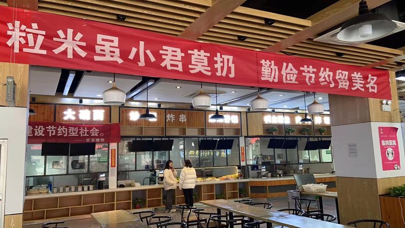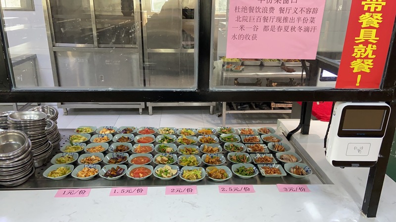 后勤基建处、后勤保障集团在食堂入口处的醒目位置,张贴倡议书、宣传海报和标语,倡导就餐师生“文明用餐、节约粮食”,大力营造营造浪费可耻、节约为荣的校园文化氛围。教工餐厅优化供餐模式,根据教职工需求每周定制菜谱,提供小份餐食,米饭、例汤实行半自助模式;学生食堂在保证菜品品种数量的同时,积极推行“半份菜”、“小份菜”销售,价格随之减半,同学们还可以按个人需求灵活增减分量。根据以往餐厨垃圾推测学生饭量,食堂将馒头、花卷的分量减少,改为约150克一个,尽量节约食材资源,降低学生消费支出,培养学生节约意识,有效解决食品浪费问题。