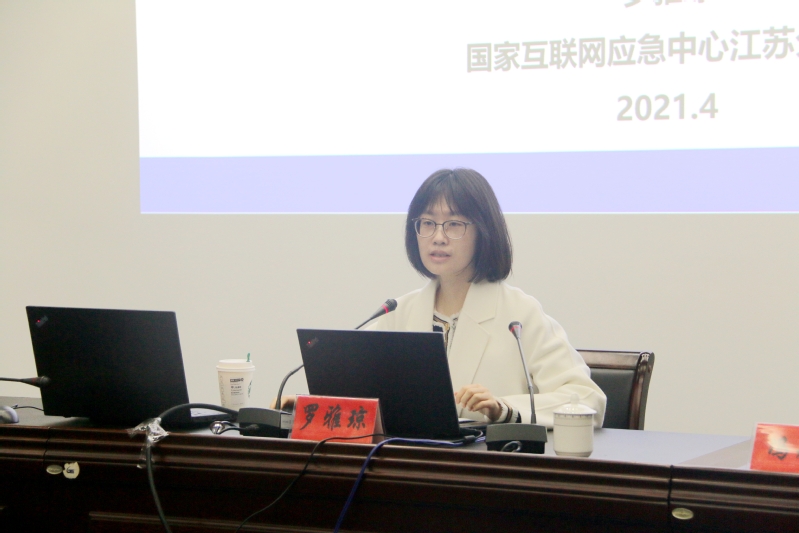 会议邀请了国家计算机网络与信息安全管理中心江苏分中心网络安全处首席安全官罗雅琼作了《网络安全形势及工作建议》的报告。她从国内外网络安全现状、江苏省信息安全现况及问题分析、新冠疫情给网络安全带来新的挑战、网络安全工作建议等方面,指导了大家在日常工作和学习生活中,如何加强网络信息安全意识以及如何避免网络信息安全问题的发生。