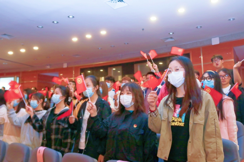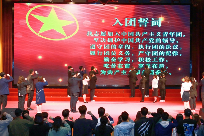 在第四篇章“团学改革”中,作为团学改革见证者的团干代表们,分享在团学岗位中服务青年、引领青年、共同奋斗的心路历程,并带领20名新团员和在场的老团员在鲜红的团旗下庄严地许下铮铮诺言。