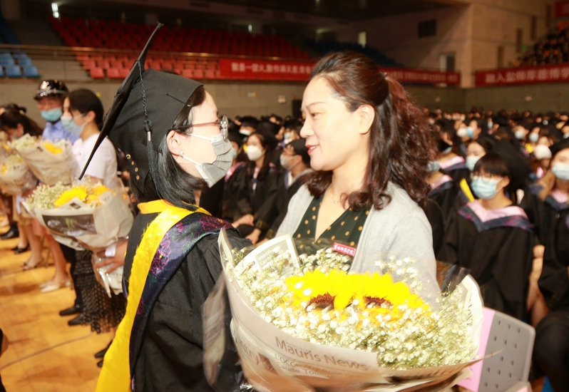 典礼上,包括任课教师、辅导员、班主任、后勤人员在内的学校各类教职工代表接受了毕业生们的献花。