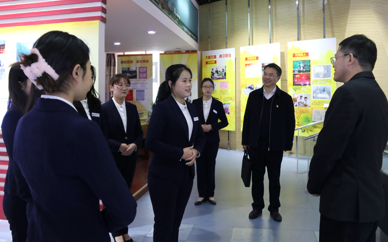 报告会后,潘迎华来到王强先进事迹展览室参观,并与大学生讲解员进行互动交流。