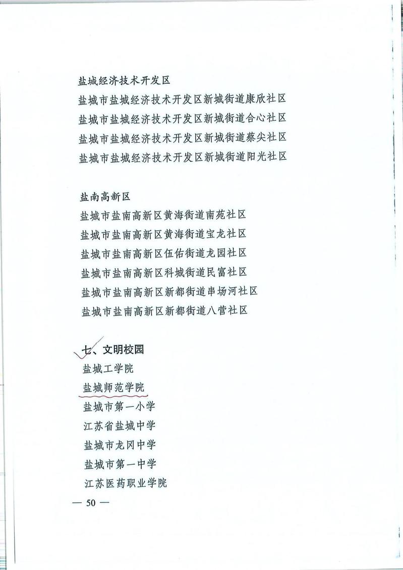 近年来,我校高度重视文明校园建设工作,将文明校园创建纳入学校事业发展规划,聚焦立德树人根本任务,围绕“思想道德建设好、领导班子建设好、教师队伍建设好、校园文化建设好、优美环境建设好、活动阵地建设好”“六个好”的创建标准扎实开展文明校园创建,学校各项事业呈现良好的发展局面。学校先后被表彰为2013-2015年度江苏省文明校园、2015-2016 年度盐城市文明校园、2017-2018 年度盐城市文明校园、2016-2018 年度江苏省文明校园。