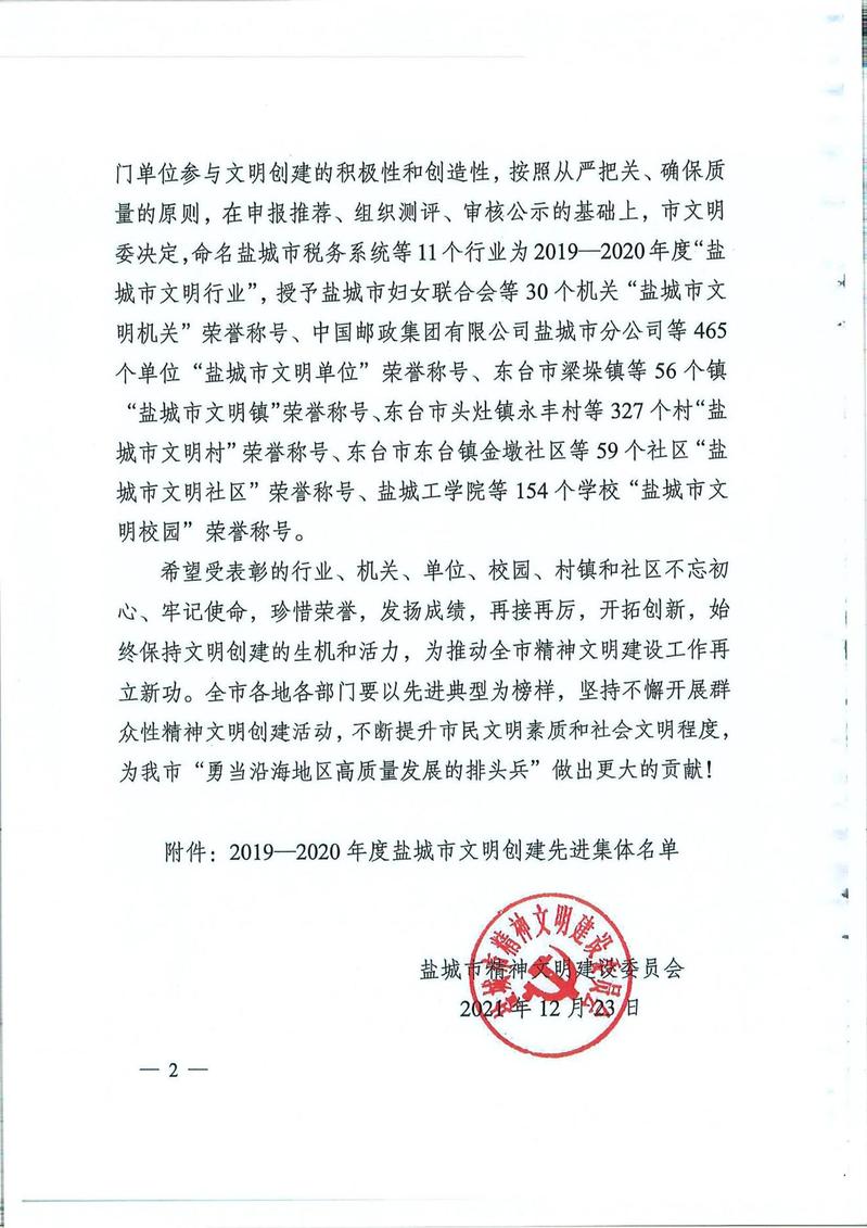 日前,盐城市精神文明建设委员会发布《关于命名表彰2019—2020年度盐城市文明创建先进集体的决定》(盐文明委﹝2021﹞9号),开元官网被表彰为2019—2020年度盐城市文明校园。