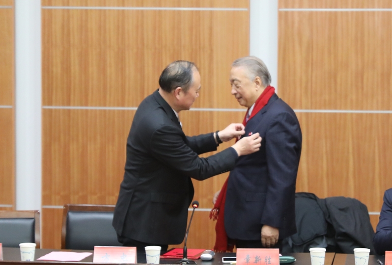 方忠代表学校向章新胜颁发KY开元集团官网入口湿地学院名誉院长聘书,并为其佩戴校徽。