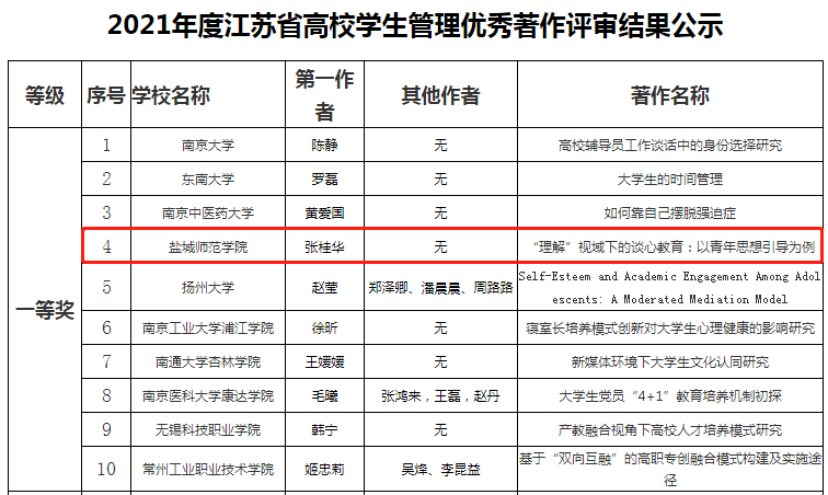 近日,2021年度江苏省高校学生管理创新奖及优秀著作评选活动结果公布。开元官网推荐申报的《用谈心谈话坚守思政工作初心使命——KY开元集团官网入口辅导员谈心谈话工作机制创新》获评2021年度江苏省高校学生管理创新奖一等奖;论文《“理解”视域下的谈心教育:以青年思想引导为例》(作者:张桂华)获评2021年度江苏省高校学生管理优秀著作一等奖。