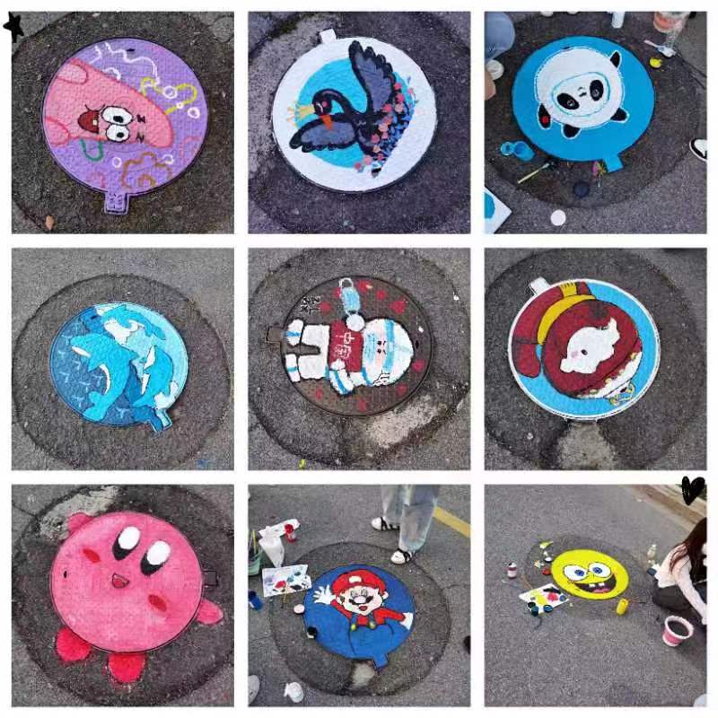 本次活动征集一经发布,得到在校数千名同学积极响应,最终选拔出十组人员,每组三到四人,分别作画,所使用的绘画材料均是防雨环保材料。完成一个艺术井盖的绘制需要多人协作,有人清理、有人调色、有人打形、有人上色,大家将简单、时尚、正能量的元素融入到画面中,用艺术扮美了校园,也让艺术走进了师生的日常生活。