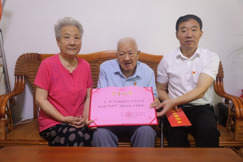 戴斌荣一行向包斌陆一军夫妇送上鲜花和慰问金,并转交了由省委老干部局颁发的江苏省“百佳离退休干部党员”的荣誉证书。戴斌荣表示,包老是全校共产党员的榜样,两位老人为全社会和青年一代树立了标杆。全校要深化学习他们助人为乐的高尚品质,以实际行动践行共产党人的初心使命。