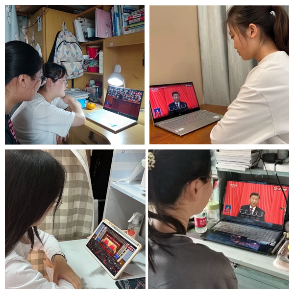 主会场庄严热烈,大家精神振奋、充满期待,与会人员聚精会神看,全神贯注听,认真仔细记,现场不时响起阵阵掌声。在各个分会场,师生党员挥舞着鲜红的五星红旗和党旗,少数民族大学生身穿节日盛装,全程认真收看开幕式。在宿舍、教室和食堂,深秋的校园里,随处可见学生自发地收听收看大会盛况。