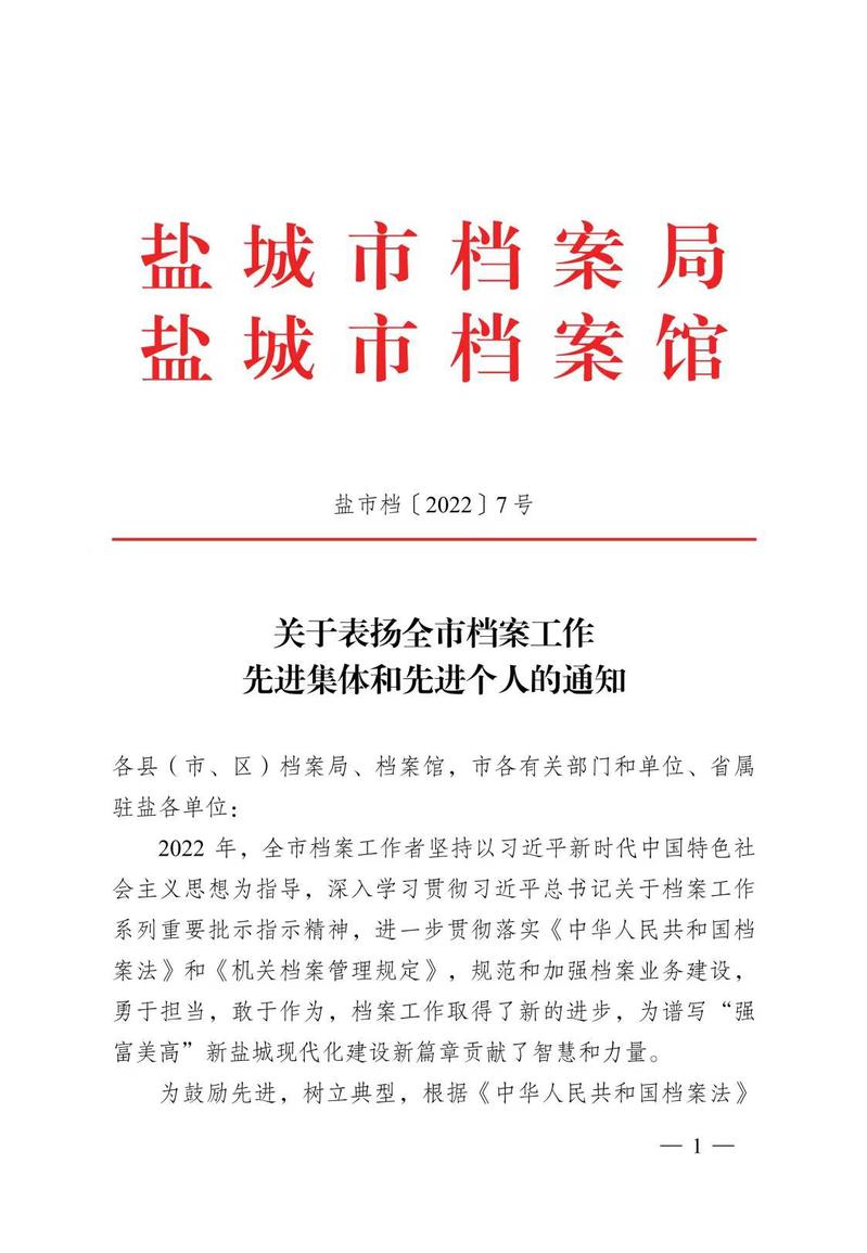为鼓励先进,树立典型,根据《中华人民共和国档案法》和国家档案局第13号令《机关档案管理规定》相关规定,盐城市档案局、盐城市档案馆对2022年全市档案工作中表现突出的先进集体和先进个人予以表扬。开元官网档案馆荣获盐城市档案工作先进集体,1人荣获盐城市档案工作先进个人。