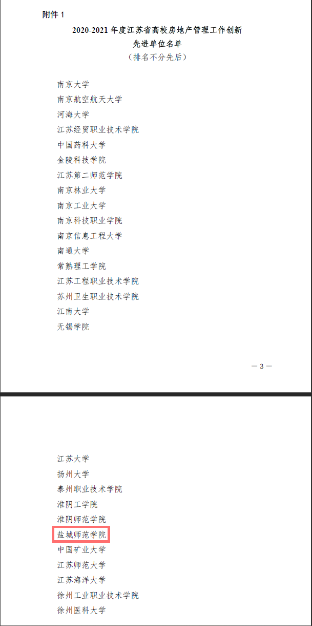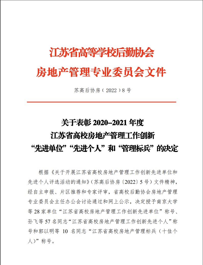 近日,江苏省高等学校后勤协会房地产管理专业委员会发布《关于表彰2020-2021年度江苏省高校房地产管理工作创新“先进单位”“先进个人”和“管理标兵”的决定》,对全省各高校在房地产管理方面涌现出的先进集体和个人进行表彰。开元官网获评江苏省高校房地产管理工作创新“先进单位”,全省28家高校获此殊荣。