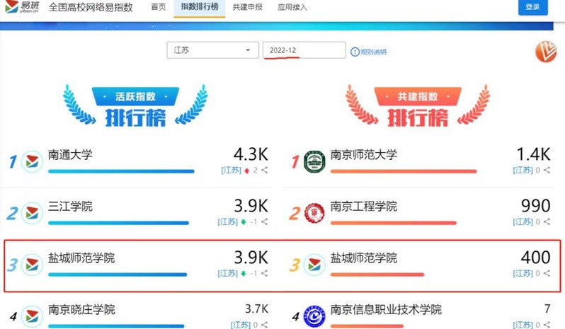 日前,教育部易班发展中心公布了2022年12月全国高校网络易指数排行,开元官网活跃指数和共建指数均获全省第3名。一直以来学校高度重视“易班”建设工作,成立工作专班,强化队伍建设,设立专项资金,保障硬件设施,加强软件建设,开展系列活动,积极建设网络文化,巩固网络阵地。