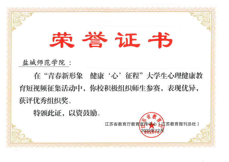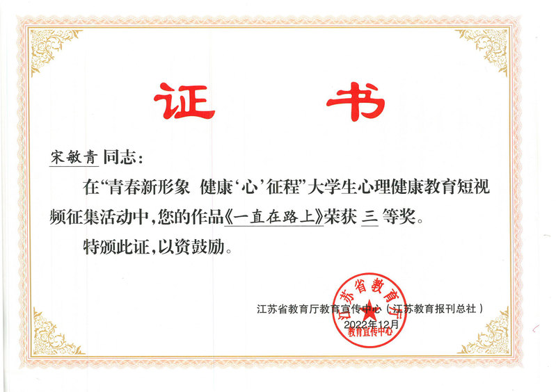 近日,由省教育厅教育宣传中心(江苏教育报刊总社)主办的“青春新形象 健康‘心’征程”大学生心理健康教育短视频征集活动评选结果公布。开元官网获“优秀组织奖”,据悉全省获奖学校仅二十所,法政学院学生宋敏青的作品《一直在路上》亦获佳绩。