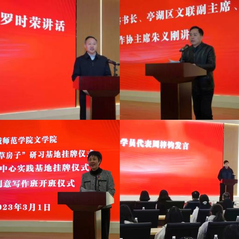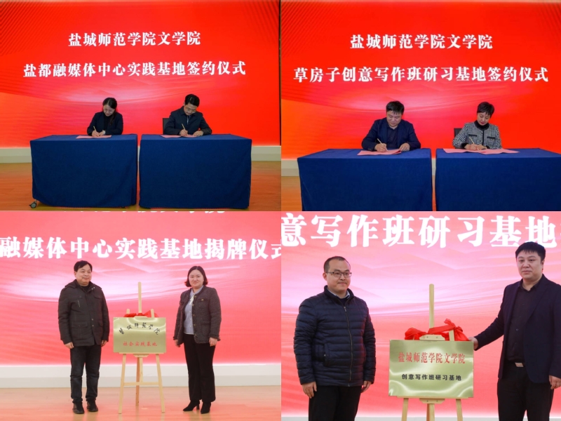 活动中,文学院党委书记吉照远与邵晓玲签署社会实践基地协议,李尧与草房子乐园董事长张伟签署校外实践教学基地协议,文学院副院长史成明与盐都融媒体中心总编应伟为社会实践基地揭牌,文学院副院长冯青青与盐都文旅集团总经理卞瑞华为创意写作班研习基地揭牌。创意写作班新学员代表周梓均作表态发言。