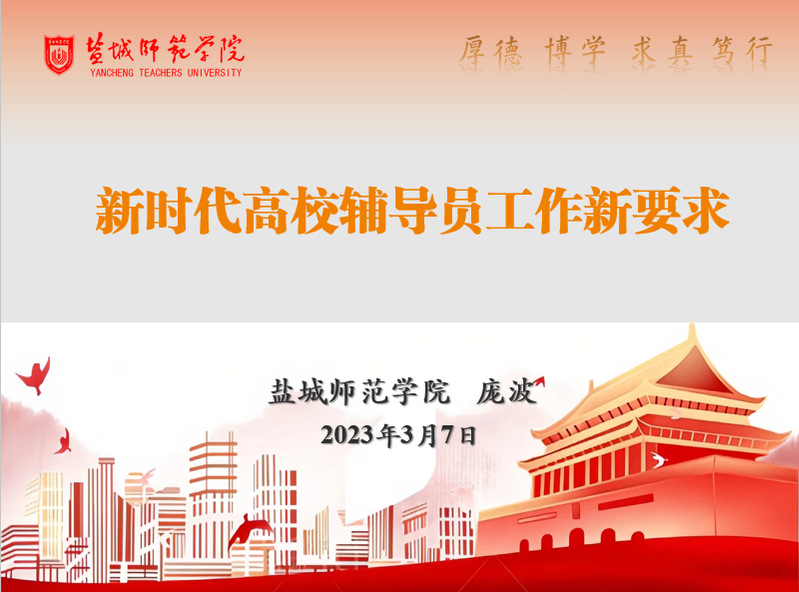 随后,庞波为全体辅导员作题为《新时代高校辅导员工作新要求》的专题讲座。他从“新时代高等教育的初心和使命”“高校辅导员的角色定位与责任担当”“辅导员素养能力提升的实践路径”等方面,详细阐述了新时代高校辅导员工作的要求。他结合学校办学特色和自身工作的学习、实践和感悟,要求全体辅导员增强主体意识,强化担当精神,以盐师“主人翁”的姿态主动设定目标,积极担当作为。