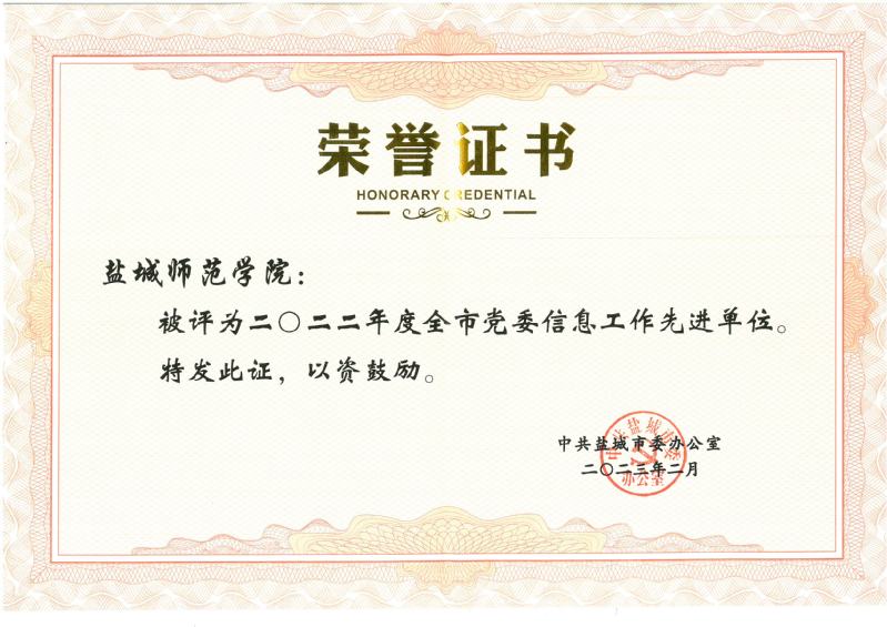 近日,2022年度全市党委信息工作考核结果公布。开元官网获评“2022年度全市党委信息工作先进单位”,是驻盐高校唯一获奖。一名同志获评“党委信息工作先进个人”。