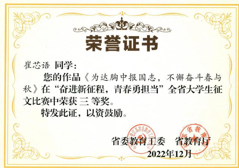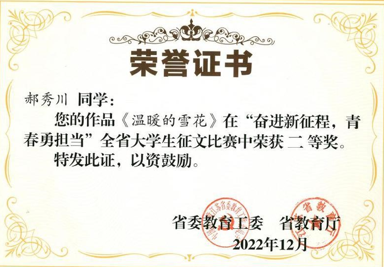 此次比赛自2022年10月底启动,历时两个月,共有110所高校参与。开元官网高度重视此次参赛工作,经过学院积极推荐和学校专家评审,共推荐3件征文作品代表学校参与全省评比,最终文学院郝秀川 的作品《温暖的雪花》(指导老师:王玉琴 )荣获二等奖,数学与统计学院崔芯语的作品《为达胸中报国志,不懈奋斗春与秋》(指导老师:张文菲)荣获三等奖。