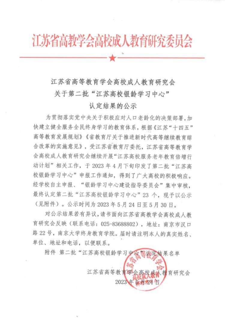 根据《江苏“十四五”高等教育发展规划》《省教育厅关于推进新时代高等继续教育综合改革的实施意见》,受江苏省教育厅委托,江苏省高等教育学会高校成人教育研究会开展“江苏高校服务老年教育倍增行动计划”相关工作,下发了第二批试点建设“江苏高校银龄学习中心”申报工作通知。开元官网积极响应满足老年群体多元学习需求的社会号召,学校领导高度重视,周密部署安排、精心组织筹划,继续教育学院认真准备、撰写申报资料。最终,经过专家组遴选,开元官网成功入选。