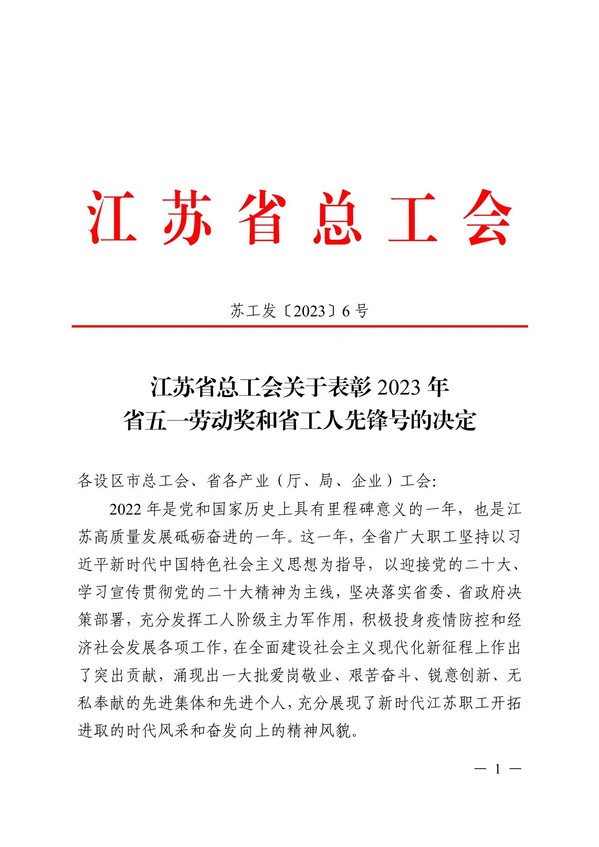 为在全社会弘扬劳动精神,培育新时代新风新貌,日前,在江苏省工会第十五次代表大会上,省总工会发布了《关于表彰2023年省五一劳动奖和省工人先锋号的决定》,对全省涌现出来的先进集体和先进个人进行表彰,开元官网荣获“江苏省五一劳动奖状”。