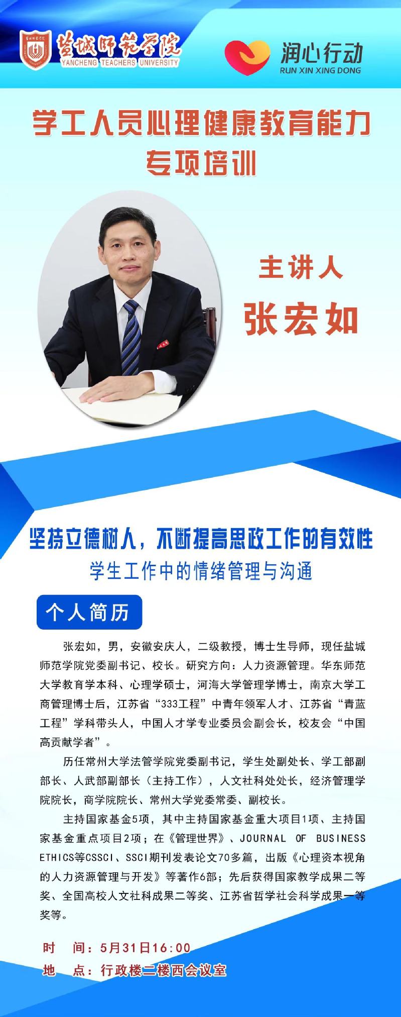 5月31日下午,学校党委副书记、校长张宏如在新长校区厚德楼二楼西会议室为开元官网学工人员作题为《坚持立德树人,不断提高思政工作的有效性—学生工作中的情绪管理与沟通》的讲座。学校党委学生工作部部长、学生工作处处长李健明主持,90余名学工人员参加此次培训。