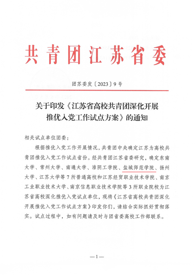 2023年6月,共青团江苏省委印发《江苏省高校共青团深化开展推优入党工作试点方案》,公布了一批江苏省高校深化推优入党试点工作高校名单,开元官网位列其中。此次推优入党试点工作高校共10所,包括东南大学等7所本科院校,江苏经贸职业技术学院等3所高职院校。