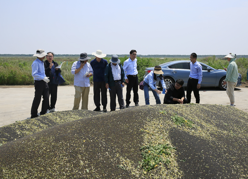 盐城市科技局副局长姜浩然,盐城市科技局科研机构与科技成果处处长胡国兵,学校科研处、湿地学院等相关负责人参加测产活动。