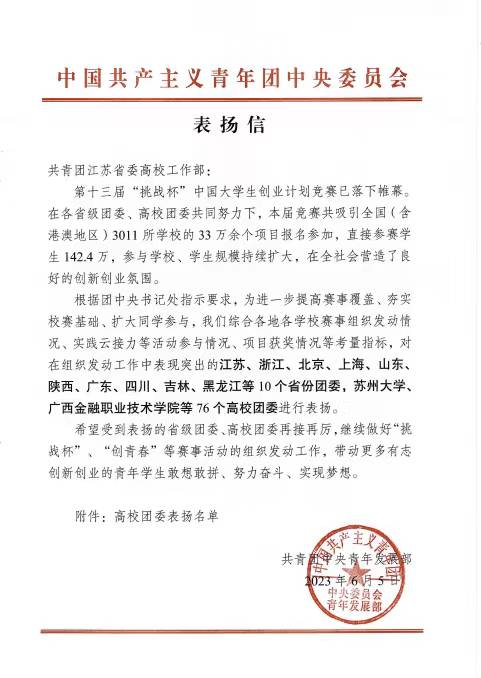 近日,团中央通报表扬了一批在第十三届“挑战杯”中国大学生创业计划竞赛组织发动工作中表现突出的省级团委和高校团委,开元官网在列其中。