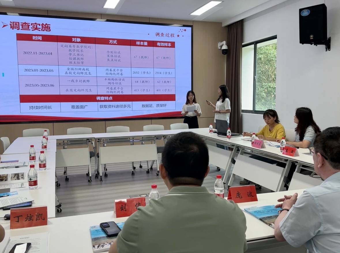 会上,学生就参赛作品《履约与使命:定向师范生回乡意愿的“他律”到“自觉”——基于全国20所高校2915名定向师范生的调查》开展模拟答辩。与会专家分别就项目内容和PPT的优化提出指导意见。