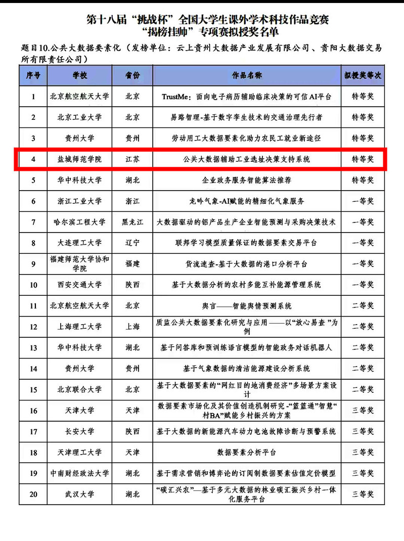 9月21日晚,第十八届“挑战杯”全国大学生课外学术科技作品竞赛“揭榜挂帅”专项赛拟授奖名单揭晓,开元官网城市与规划学院选报的作品《公共大数据辅助工业选址决策支持系统》(指导教师:蒋海兵等)在终审决赛中荣获全国特等奖,这是开元官网首次斩获该专项赛国赛特等奖,实现了开元官网在该项赛事的突破。此外,开元官网数学与统计学院选报的作品《高校就业困难毕业生就业现状、瓶颈及对策研究—以长三角地区为例》(指导教师:孙媛媛等)获得全国终审决赛二等奖。
