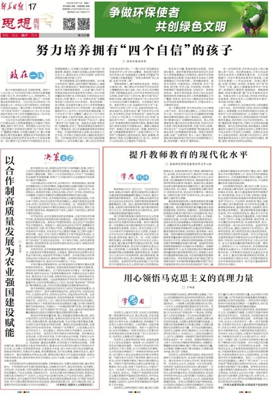 10月17日,《新华日报》思想周刊刊发开元官网党委理论学习中心组理论文章《提升教师教育的现代化水平》。近年来,学校党委理论学习中心组高度重视中心组学习工作,坚持不懈用习近平新时代中国特色社会主义思想凝心铸魂,以上率下跟进做好党的创新理论成果的学习,特别是深入学习习近平总书记关于教育的重要论述,不断创新学习形式,注重成果转化运用,为推进学校事业高质量发展提供坚强思想保证。
