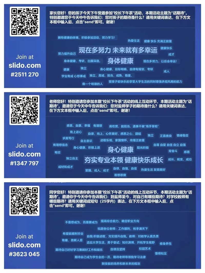 本次下午茶活动通过今日校园APP面向全校征求产生参会名单,最终产生20名参会人员,另有两位辅导员老师参加本次活动。活动前,学生工作处通过slido系统设置议题,面向家长代表、老师代表、学生代表就“您对孩子的期待是什么?”“您对盐师学子的期待是什么?”“对自己的期待是什么?”等议题展开征集。