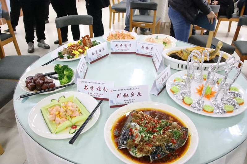 学校各分工会推荐的厨艺高手在大赛上各显身手,为大家奉献了一席精美的饕餮盛宴。选手煎炒烹炸、焖溜熬炖,个个厨艺娴熟精湛。一份份摆盘精致、一道道香味扑鼻的菜肴顺序呈现在大家面前,创意十足的荷塘月色、花开富贵、书香雅韵、天鹅排骨,香气诱人的松鼠桂鱼、可乐鸡翅、清蒸鲈鱼……现场评委及观众赞不绝口,纷纷拿出手机拍照留念,好一派热闹景象。