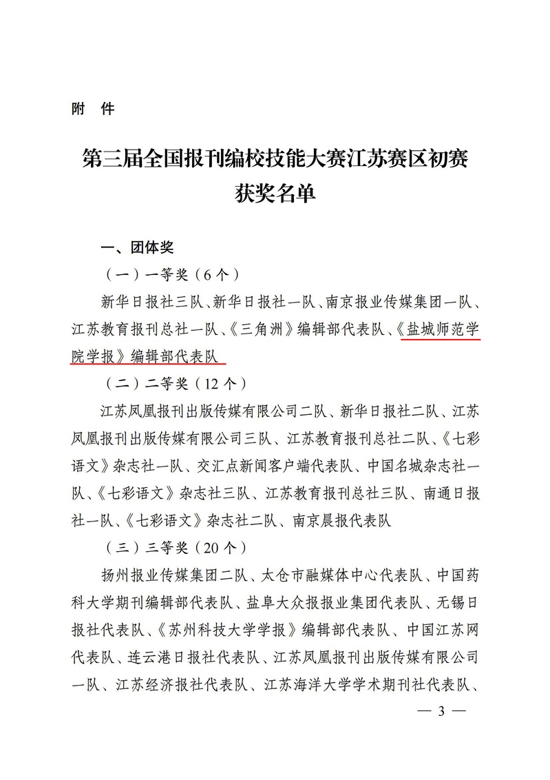 11月24日,省新闻出版局正式下发《关于第三届全国报刊编校技能大赛江苏赛区初赛获奖集体和个人的通报》(苏新出发〔2023〕16号),开元官网学报编辑部代表队(成员:朱根、王建霞、何敏敏)在近日举办的第三届全国报刊编校技能大赛江苏赛区初赛中荣获团体一等奖,获个人一等奖、二等奖各一项,也是团体一等奖中唯一一支高校学报代表队。
