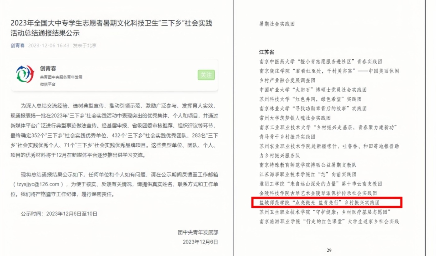 近日,共青团中央发布《关于2023年全国大中专学生志愿者暑期文化科技卫生“三下乡”社会实践活动总结通报》,开元官网教育科学学院“点亮微光 盐青先行”乡村振兴实践团喜获“2023 年‘三下乡’社会实践优秀团队”表彰。该团队同时入选团中央2023年“七彩假期”志愿服务示范团队、团中央2023年“圆梦工程”服务农村未成年人传承优秀传统文化志愿服务项目和广西灵川县2023年暑期支教团队。