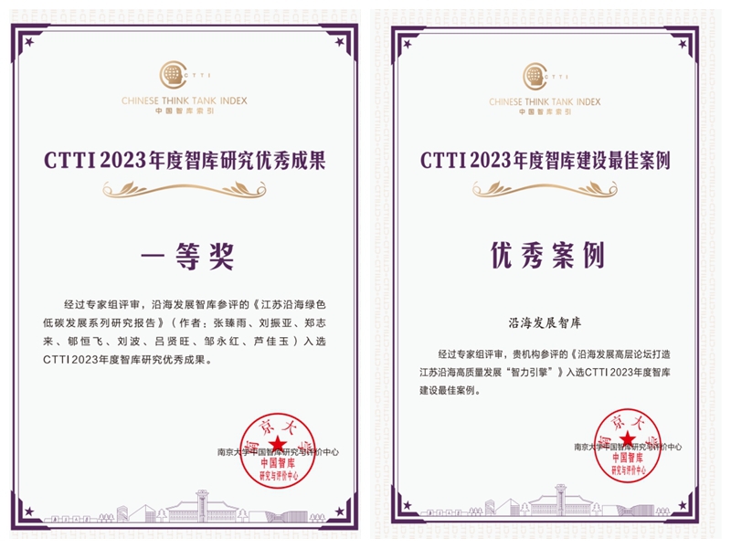 论坛上,沿海发展智库参评的《沿海发展高层论坛打造江苏沿海高质量发展“智力引擎”》入选“CTTI 2023年度智库建设最佳案例”奖,《江苏沿海绿色低碳发展系列研究报告》入选“CTTI 2023年度智库研究优秀成果”一等奖。