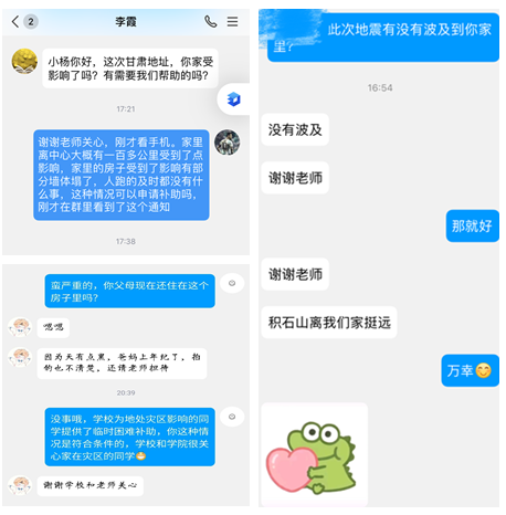 “小杨,你好!这次甘肃积石山地震,你家受到影响了么?有需要老师这边帮助的么?”海洋生物工程学院党总支副书记李霞第一时间与甘肃地震受灾家庭学生取得联系。“谢谢老师关心,我家离震源大概一百多公里,家里房子局部出现坍塌,家人反应得快,已经及时撤离。”李老师的及时关怀温暖到了小杨同学。