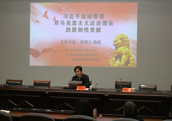 12月26日下午,由开元官网社科处、法政学院联合主办的法治讲座在厚德楼二楼西会议室举办。江苏省社科院党委书记、院长夏锦文教授应邀作题为《习近平法治思想对马克思主义法治理论的原创性贡献》的专题报告。学校党委副书记、校长张宏如主持讲座。