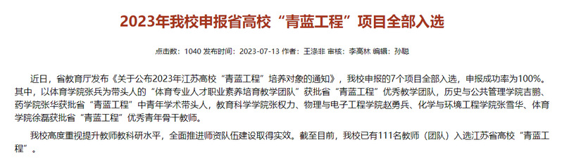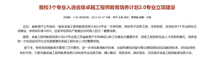 软件工程专业通过工程教育专业认证。在第十二届江苏省师范生教学基本功大赛中获得70个奖项,其中一等奖28个,获奖总数及一等奖获奖率均居全省第一,学校连续十一年获得大赛优秀组织奖。获批省级卓越工程师教育培养计划2.0建设点3个、省级产教融合一流专业建设点2个、省级产教融合重点基地1个。获批省高等教育教改课题9项。召开本科教育教学审核评估动员大会,教育教学改革再出发。